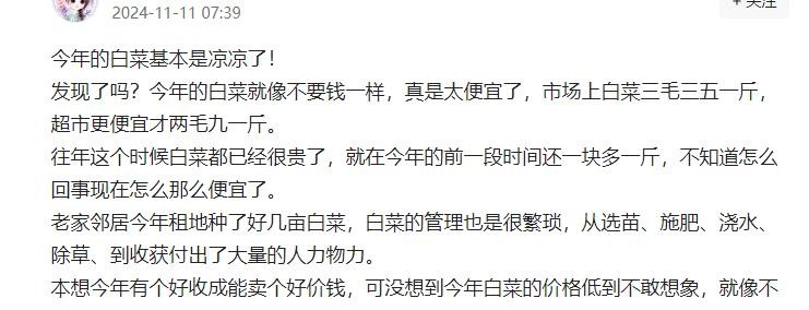 咫尺之间的中国,网友纷纷心疼农民,因为白菜太便宜了。