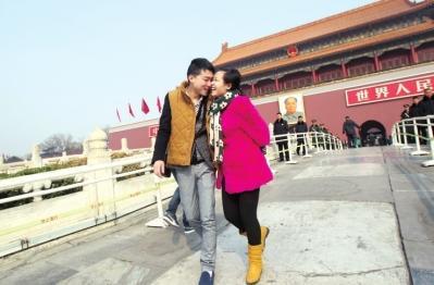 2014年5月,因为看病第一次来北京,海斌和冯莹在天安门前留下亲密合影。