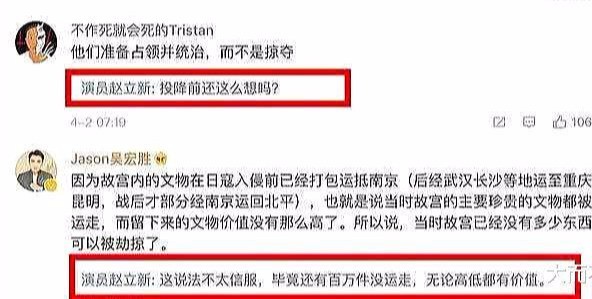 关于第二个问题,赵立新回答说自己因为准备作品的时候,翻阅了单霁翔、耿宝昌两位先生的一些文章,认识到了侵略具有非常大的复杂性,所以才在微博做碎片化提问,目的是引导大家认识到侵略的复杂性,但适得其反遭到误解。
