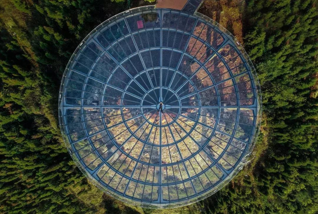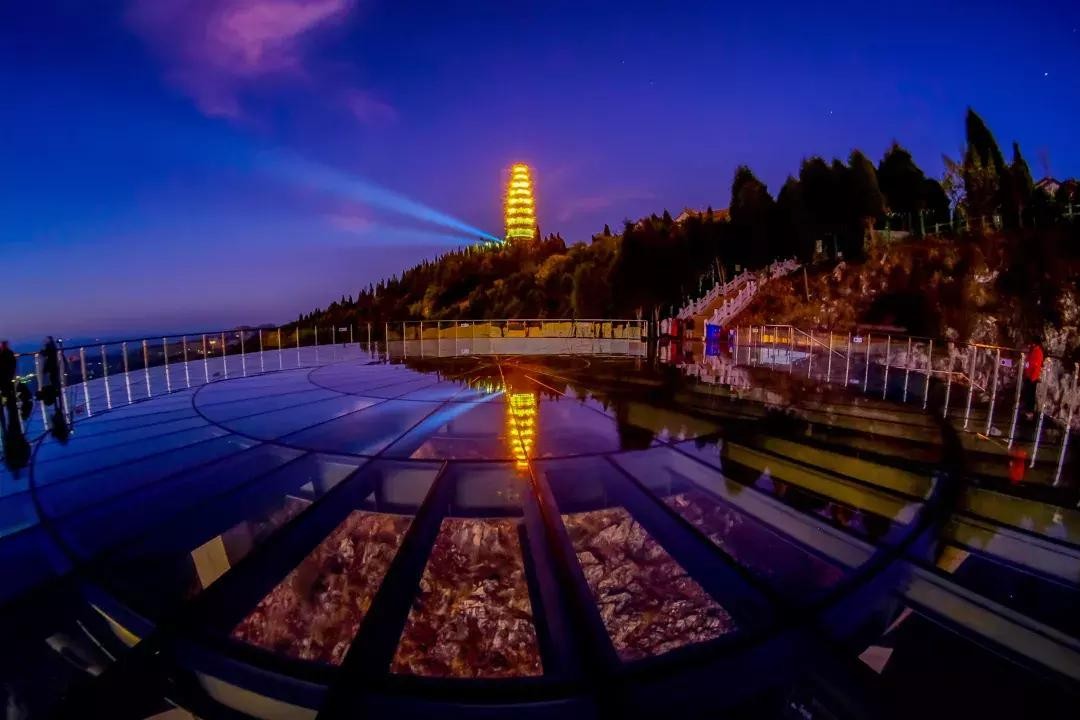 老阴山护林防火瞭望台(老阴山玻璃栈道)共设三处瞭望平台,其中:一号平台(悬挑长19.3m)设立柱,离地最高高度39m;二号平台(悬挑长27m)设斜支撑柱,离地最高高度63m;三号平台,由直径30m的圆形组成,离地最高高度18m。