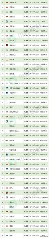 中型SUV入榜车型100款。其中混动5款,手动4款,自动两驱50款,自动四驱41款。