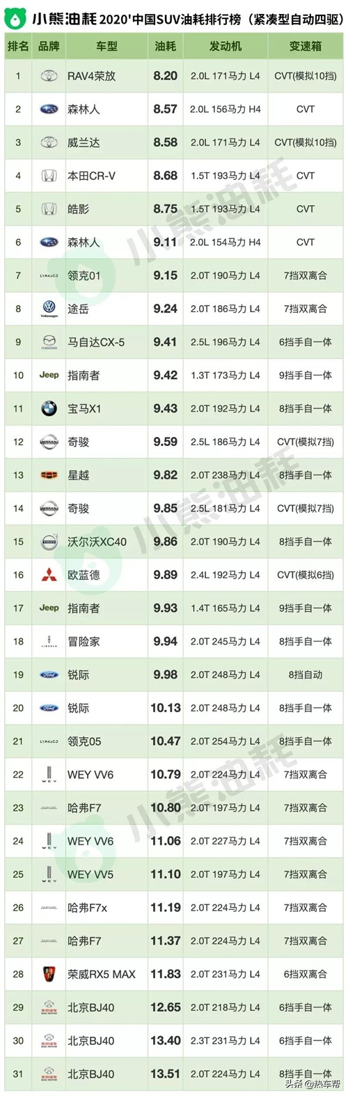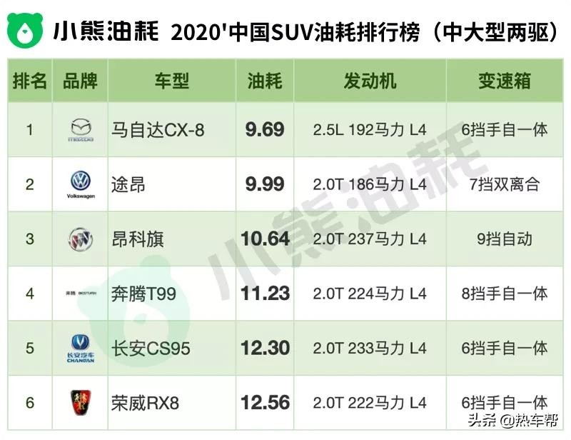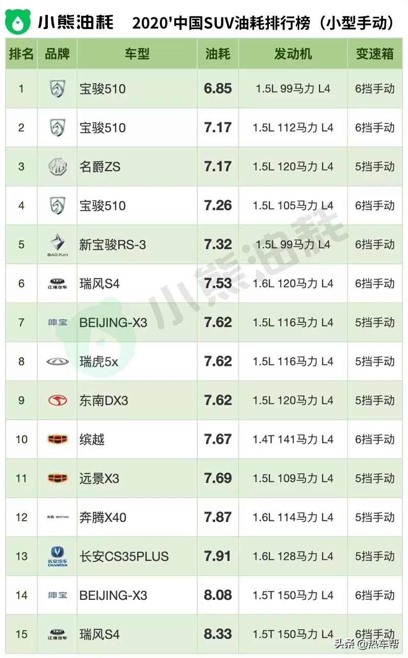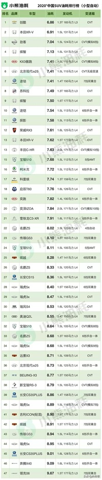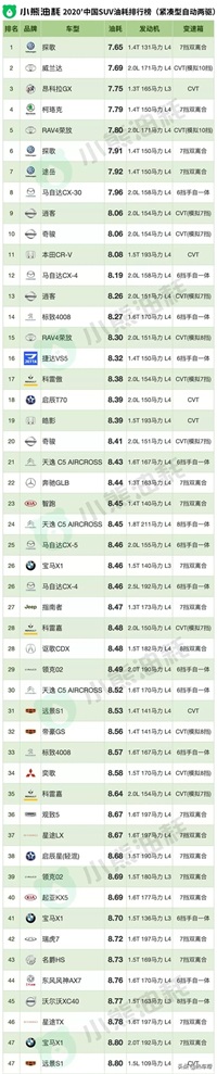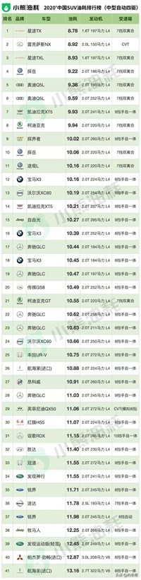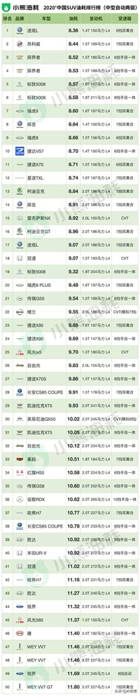 小熊油耗:2020年度中国市场SUV油耗排行榜-393款