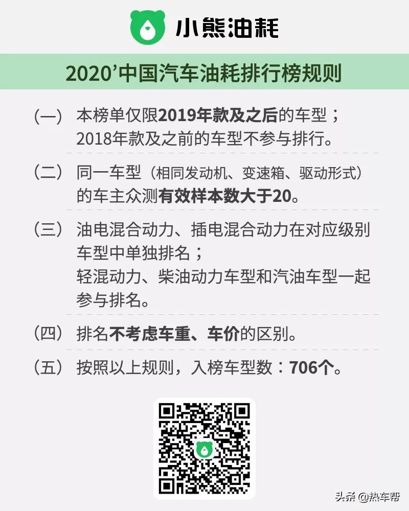 「2020’中国汽车油耗排行榜」是基于小熊油耗真实车主用户提交的加油记录统计制作。排行榜制作过程采用严谨的统计方法,如实反映各款车型在车主实际使用中所体现出的油耗性能。