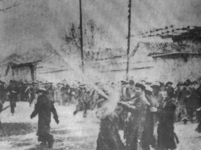 游行队伍遭到反动军警高压水龙喷射学生们夺过水龙与之搏斗