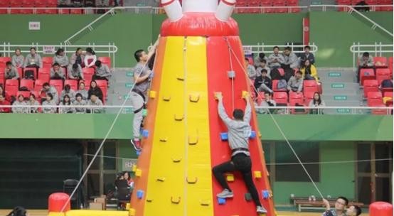玩法:队员们需系好安全带,教练发令后,开始往充气道具顶部爬行,最先到达顶部的队员获胜。