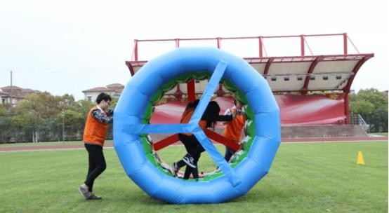 玩法:两名队员站到充气道具内,其他的队员在外边控制方向,当教练发令后,小队开始往终点移动,率先抵达的队伍获胜。