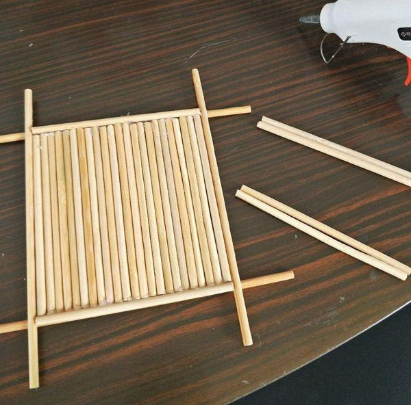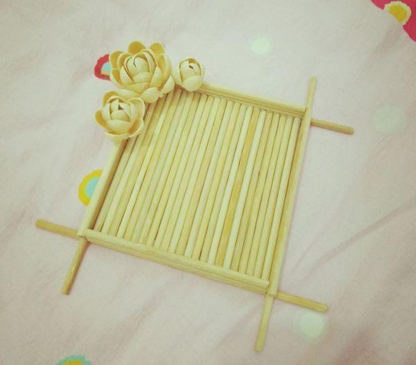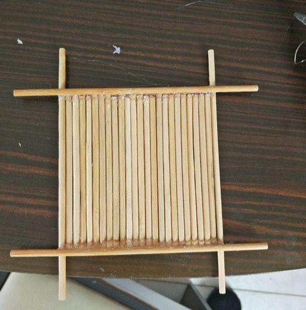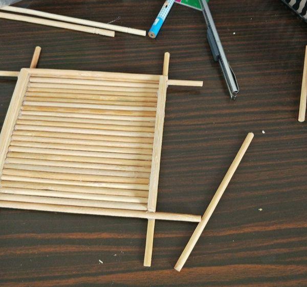 6、剪取两支和凹边相同长度的筷子,粘上。