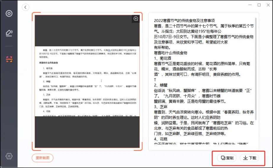 进入“智能输入助手”找到“截屏”功能,将所需识别的区域框选并进行截屏提字,识别后的文字便可进行复制、下载等后续操作。