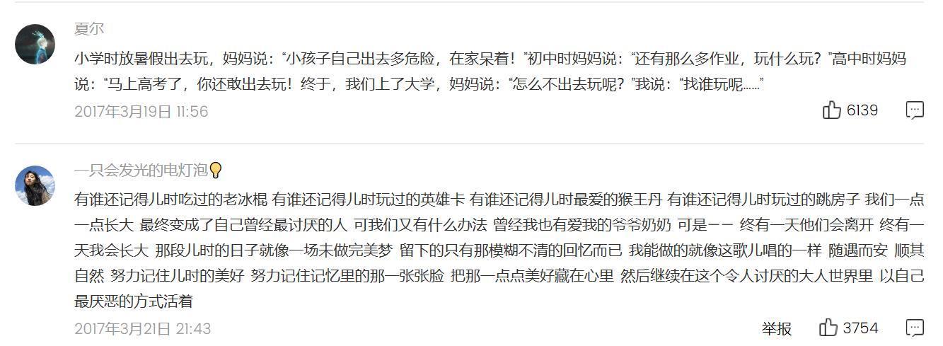 姚晨曾分享过这首歌,她说:“我们就一天天长大,大到再也钻不回记忆中的那个故乡。”