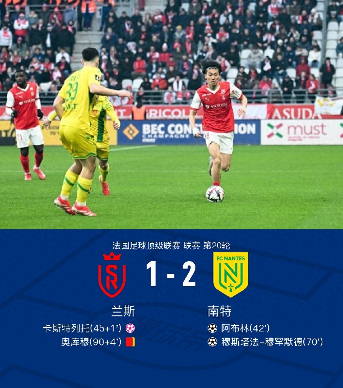 在法国足球顶级联赛第20轮的较量中,兰斯坐镇主场迎战南特。比赛中,南特的齐里维拉送出精妙助攻,帮助阿布林成功破门。随后,南特的卡斯特列托不慎自摆乌龙,为兰斯扳回一城。比赛进入下半场,阿布林再次展现出色表现,助攻穆斯塔法-穆罕默德再下一城。比赛接近尾声时,兰斯的奥库穆因累计两张黄牌被罚下。最终,南特以2-1的比分战胜兰斯,取得了这场比赛的胜利。
