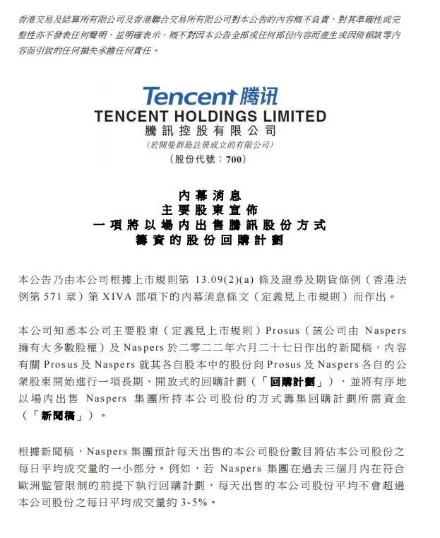 公告称,Naspers集团预计每天出售的公司股份数目将占公司股份之每日平均成交量的一小部分。例如,若Naspers集团在过去三个月内在符合欧洲监管限制的前提下执行回购计划,