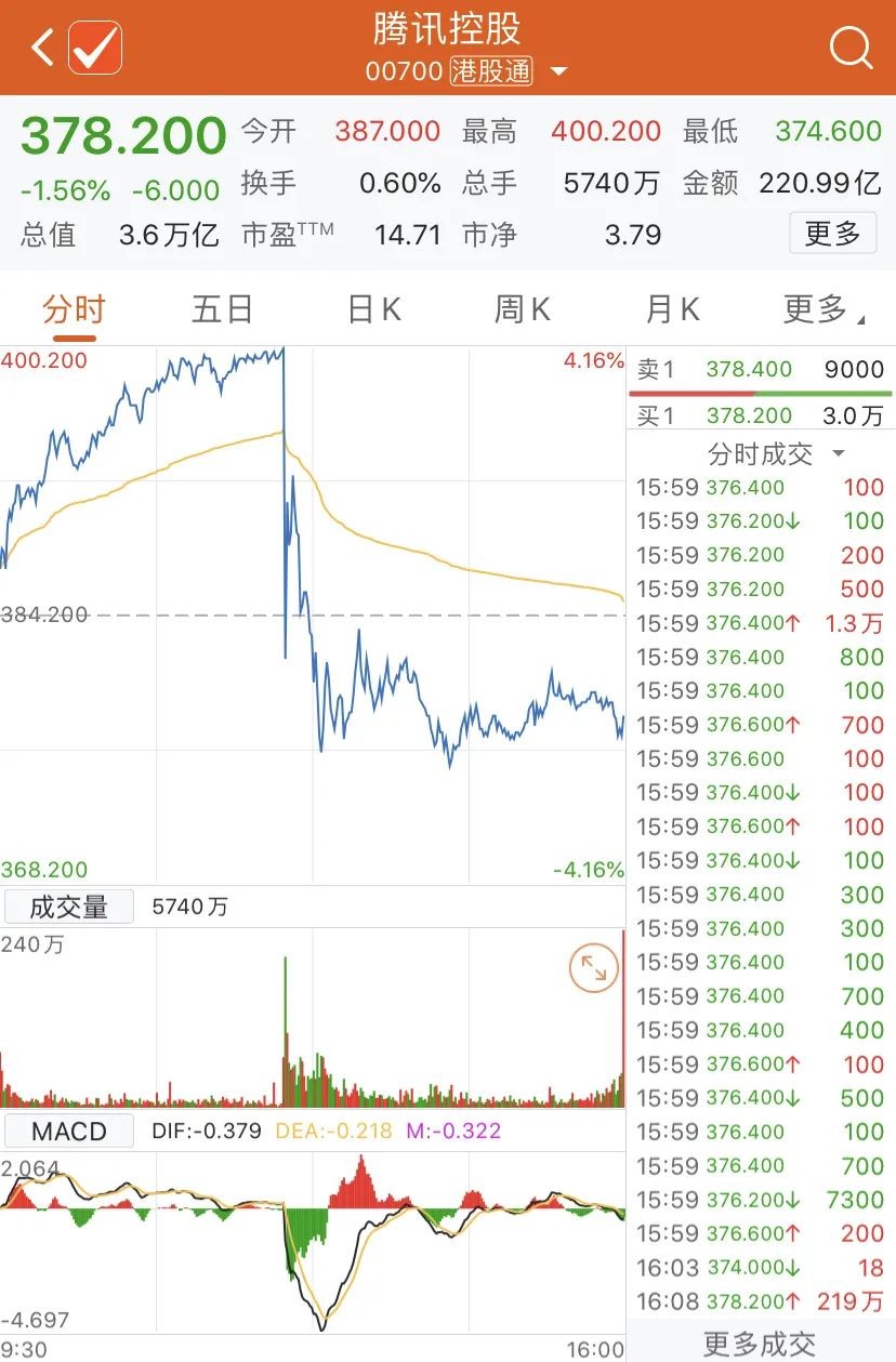 6月27日午后,腾讯控股开盘后直线跳水。盘中跌幅一度接近2%,而早盘盘中,腾讯一度大涨4.16%。截至收盘,腾讯控股跌1.56%,报378.20港元/股。