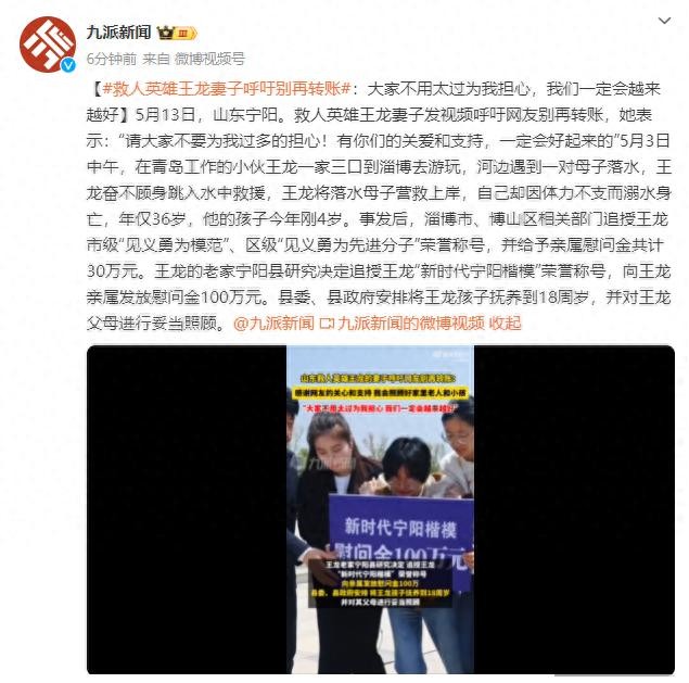 5月13日,山东宁阳。救人英雄王龙妻子发视频呼吁网友别再转账,她表示:“请大家不要为我过多的担心!有你们的关爱和支持,一定会好起来的”。5月3日中午,在青岛工作的小伙王龙一家三口到淄博去游玩,河边遇到一对母子落水,王龙奋不顾身跳入水中救援,王龙将落水母子营救上岸,自己却因体力不支而溺水身亡,年仅36岁,他的孩子今年刚4岁。事发后,淄博市、博山区相关部门追授王龙市级“见义勇为模范”、区级“见义勇为先进分子”荣誉称号,并给予亲属慰问金共计30万元。王龙的老家宁阳县研究决定追授王龙“新时代宁阳楷模”荣誉称号,向王龙亲属发放慰问金100万元。县委、县政府安排将王龙孩子抚养到18周岁,并对王龙父母进行妥当照顾。