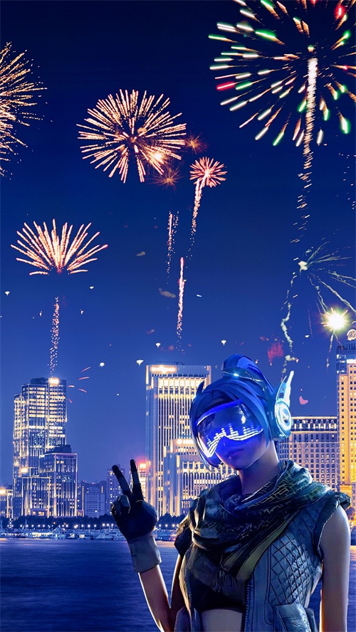 狂沙舞者套装的背景,对岸是灯火通明的高楼大厦,天空中还有烟花,好一派热闹繁华的景象,小鱼干觉得这个梦幻火箭眼镜的反光效果,画的真是特别的好。