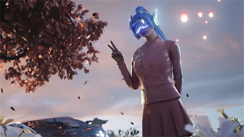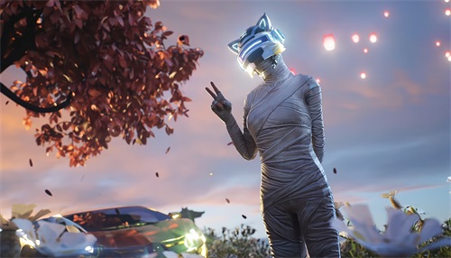 再来看另一张,这回角色用的是梦幻火箭头发和眼镜,天空中有淡淡的晚霞,还有几个孔明灯,落叶一片片洒落在跑车上,整体又是不一样的意境。