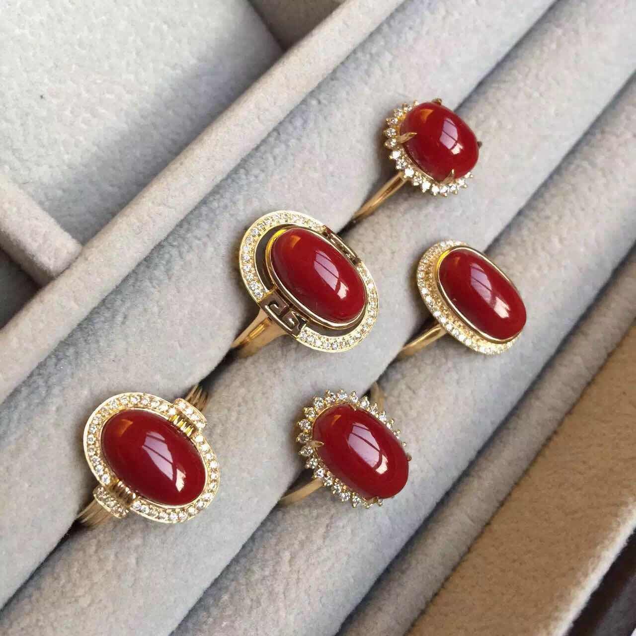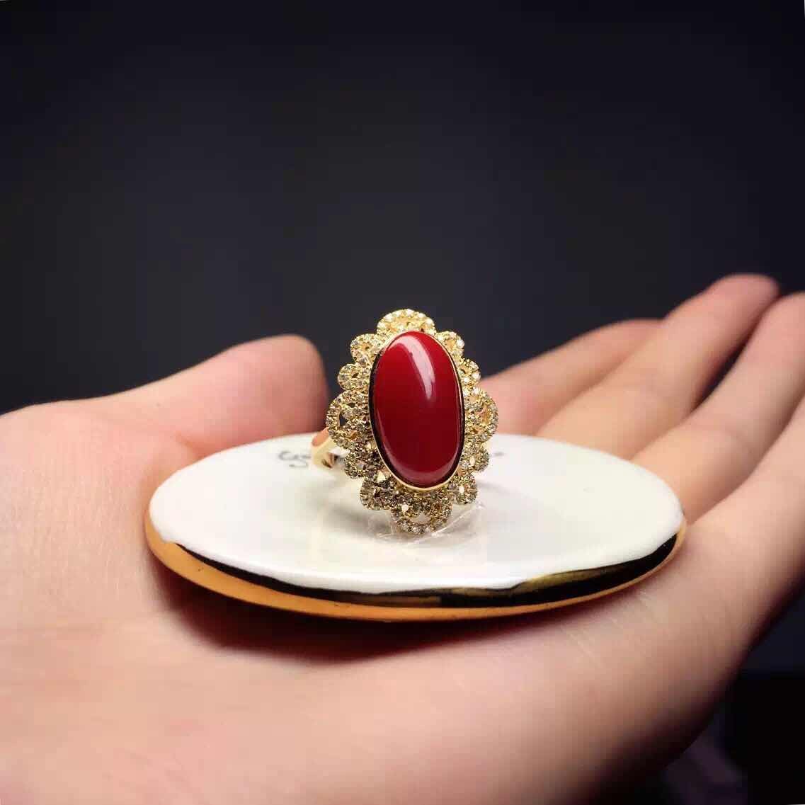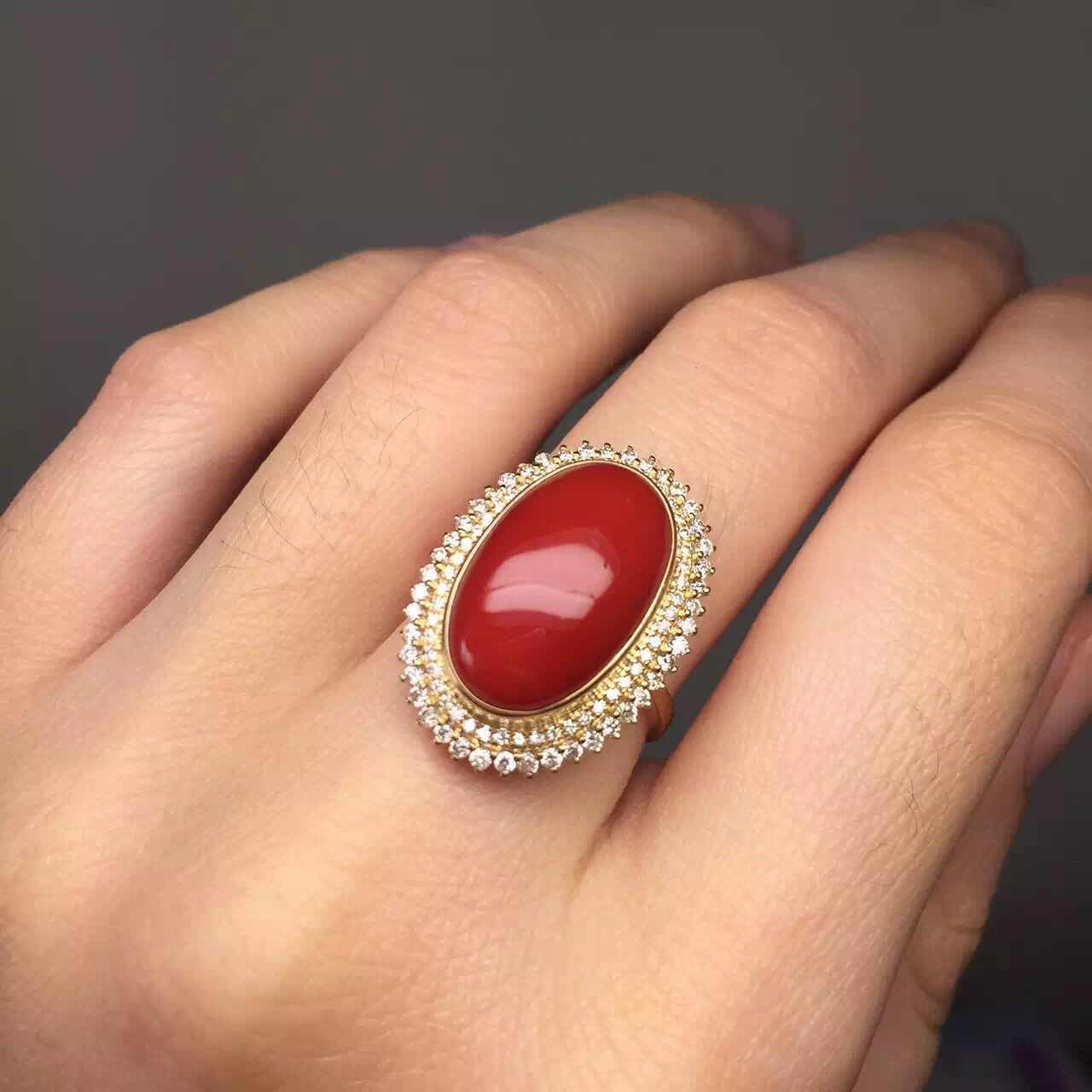 顶级日本阿卡红珊瑚豪镶18K金钻石戒指