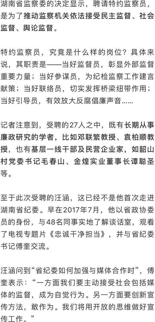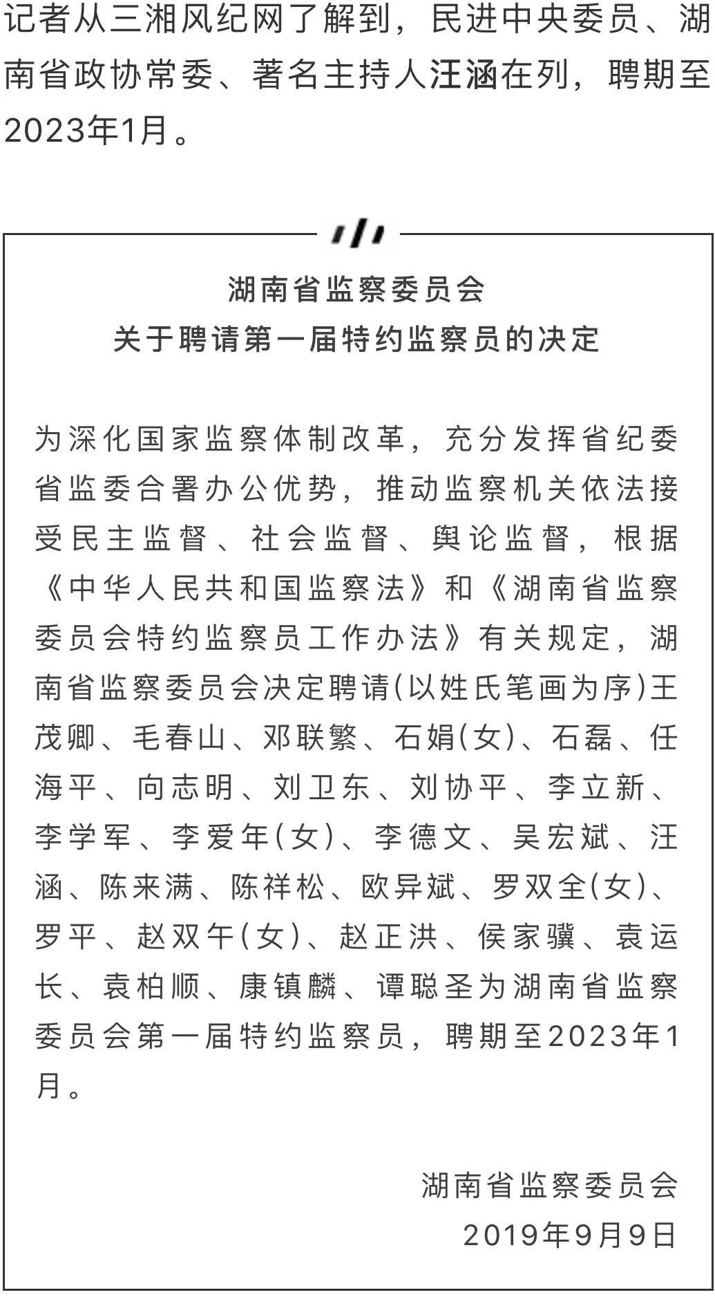 汪涵赴任湖南省监察委