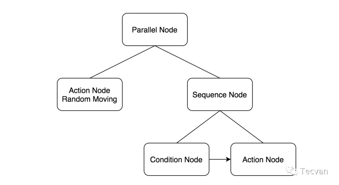 在这几个基础的叶子节点上,搭配上文提到的 并行、顺序 等节点,就可以组成一棵简单的 AI 行为树:AI 一边随机移动,一边搜索当前范围内是否存在敌人