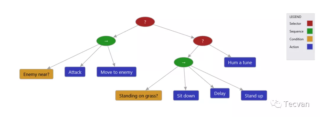 在我们创造 AI 角色之后,下一步就需要给他们赋予生命,让他们能够移动,能够攻击,甚至给他们更加真实的一些反应,比如挨打了会逃跑,会追杀玩家...etc。要实现这样的 AI,让我们先来了解一下游戏 AI 的一种比较常用的实现方式——决策树(或者叫 行为树)
