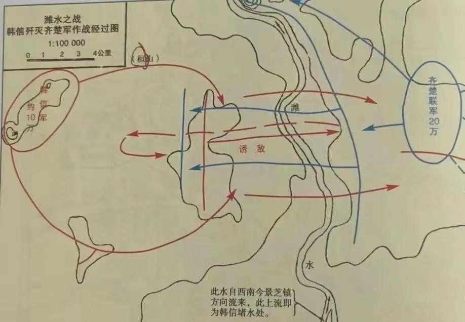 当韩信攻破临淄的时候,项羽派大将龙且与齐王合力攻打韩信,号称二十万大军。有人向龙且献计道:“我们应该先招抚沦陷的城池,使得齐王存,然后破其粮道,汉军得不到粮食,将不攻自破。”龙且轻视韩信,又急于求成,不用此计,率军与韩信隔淮水(山东境内淮河)摆开阵势。