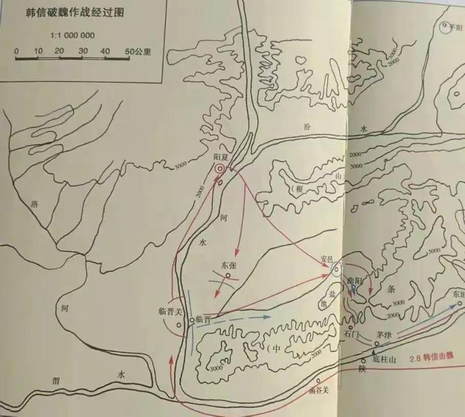 于是,汉王派韩信讨伐魏王。魏王将主力驻守临晋,想阻止韩信渡黄河。于是韩信采用声东击西之策,先是布疑兵假装要过黄河的样子,自己则率军在上游夏阳过黄河,偷袭安邑。魏王措手不及,率军迎击韩信,最后兵败被俘,就此,魏地平定。汉王在魏地设置河东郡。