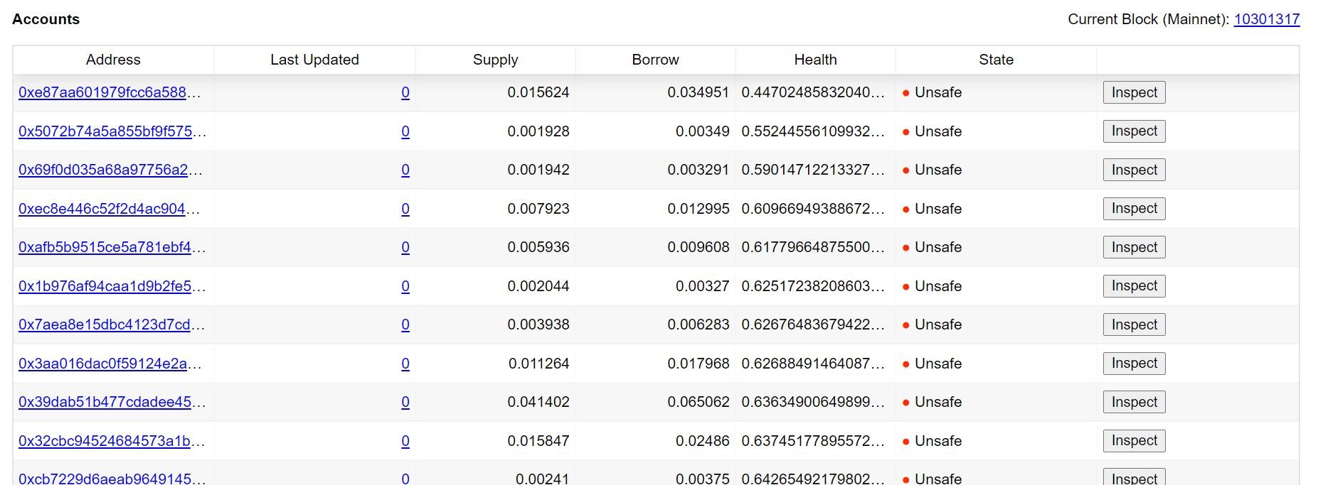 下面提供ZenGo研究文章内给的实例,让读者进一步了解清算过程,首先通过工具网站找到当前可以被清算的借款,
