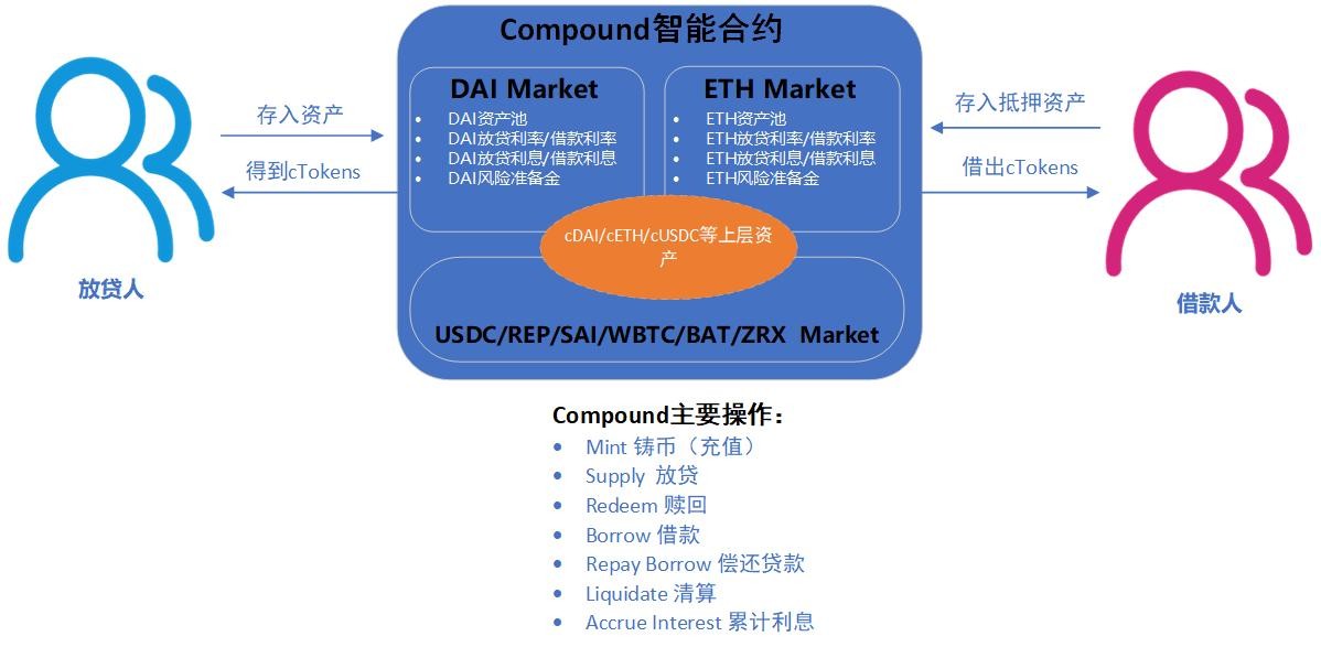 Compound协议是建立在以太坊上,存款和借款供需双方关系通过算法来计算利率的资金池模式。存款者直接向资金池存款,获取浮动的利息收益,而无需和对手方协商到期日、利息率抵押物等。