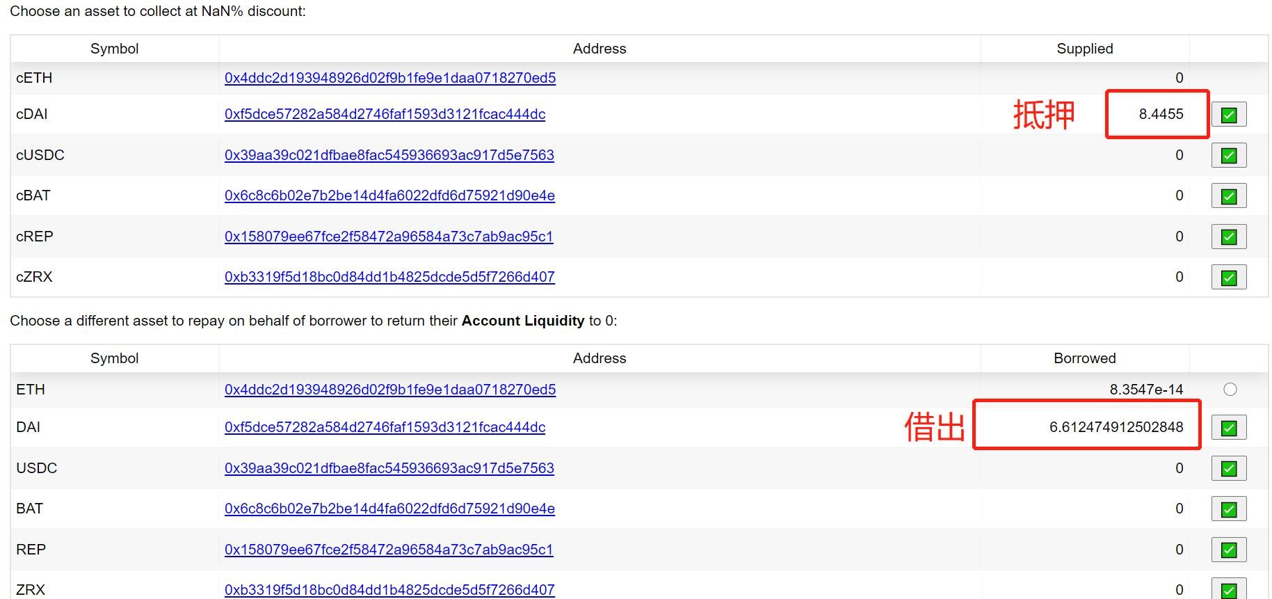 可以看到该用户抵押了2.46个cDAI,借出了0.00684个ETH,
