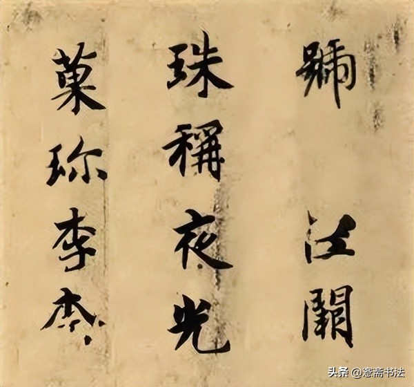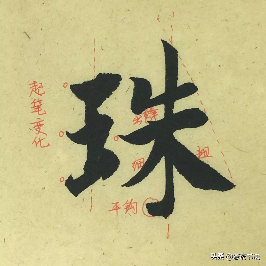 “珠”字左右结构,左短右长,左小右大,突出了对比的关系。字的外形也值得关注,因为笔画均以组的形式出现,故外形较整不凌乱。另外,几个横画起笔角度不同,打破概念化,值得关注。