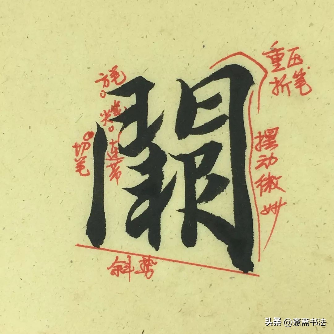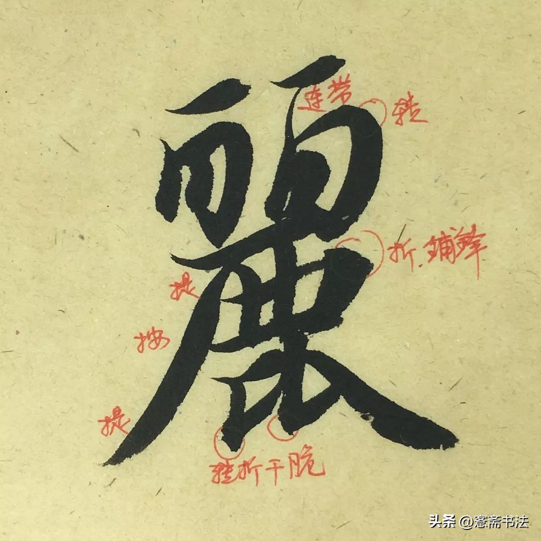 “丽”字是一个梯形的轮廓。写的时候上方紧凑,下方撇捺舒张。短线条为主,虽然繁琐,但运笔尤其要交代清楚。比如图中右方标出的两个转折,一个是转一个是折,运笔不同,要加以区分。也要注意线条与线条之间的连带关系。