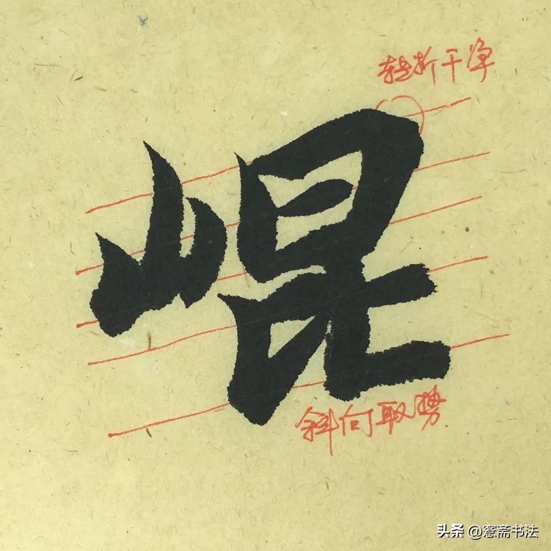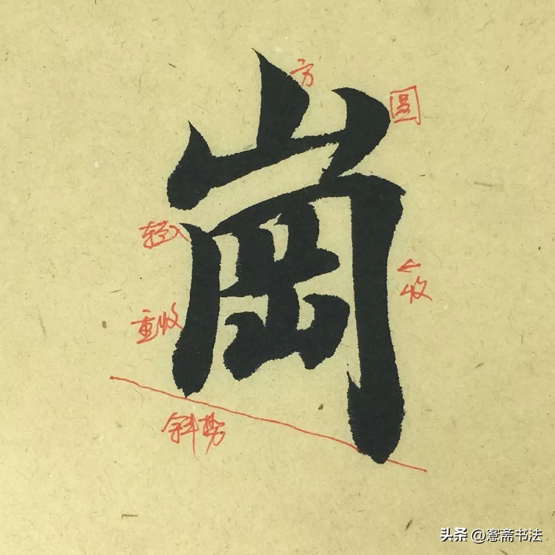 “岗”字呈斜势。上下两部分,上轻下重,上方两个小竖入笔方圆各不相同,临写时注意区分,甚至强化。下面“冂”部左短右长,不要过于近似。要注意运笔时线条具体的形态和弧度。
