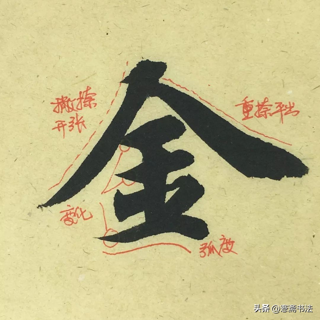 “金”字笔画不多,线条较为粗重。撇的入笔有一个自左向右的调锋动作,这个动作保留在了纸面上,然后向左折后缓缓撇出,应将笔尖送到线条最末端,不可快速弹出,否则线条轻浮。