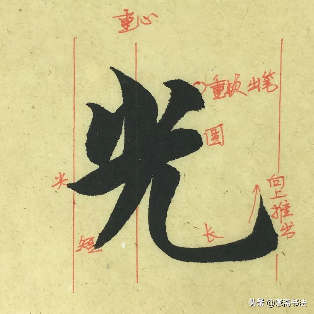 “光”字是一个典型的字内空间疏密对比很强的字。要注意观察字内的负空间,强化这种关系,使特征突出。另外,最后一笔,“勾”出锋时缓缓推出,将笔尖送到最末处。