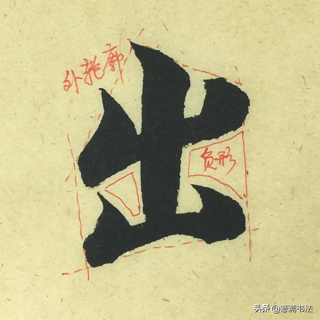 “出”字与“玉”字都是粗线条的字,按笔为主,这两个字成为一个字组。在临帖时要学会观察字与字之间的关系,或对比或成组。并要善于将这种关系运用于创作,使作品有节奏有韵律。