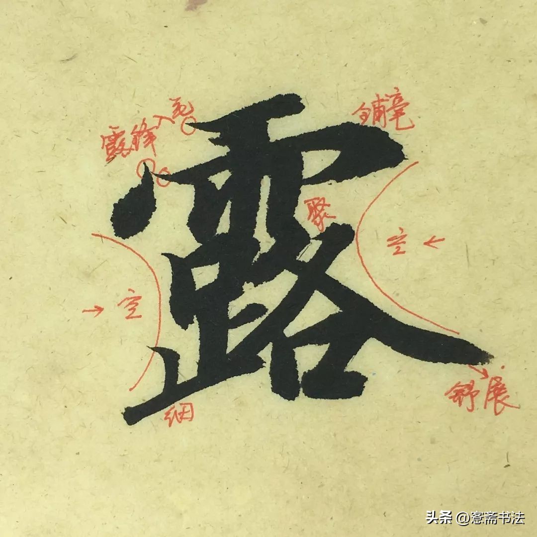 “露”字是提笔的典型代表,整个字笔画繁密,故线条舒展劲瘦。临习时我常会提醒学员注意笔画的提按特征,粗者令其粗,细者令其细,节奏特征将会更明显。