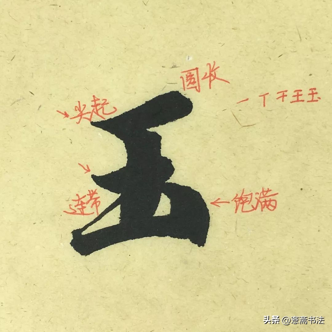 “玉”字笔画较少,线条粗重,铺毫行笔,写的时候要使笔画粗重而不臃肿。中间一竖是整个字中最粗的一笔,可以强化。三个横的形态和起收笔角度不一样。尤其后两横之间有连带关系,使得最后一横折锋入笔,需要准确表现。