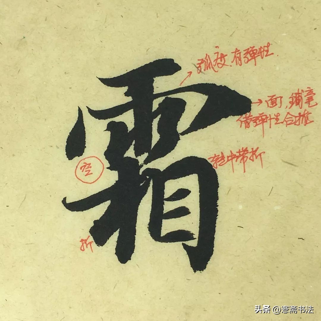 “霜”字横勾是重点,横画极细,容易写得轻浮,故要善于用腕,写出线条的弹性。勾要铺毫侧锋转中锋,轻轻推出,呈面状。下方“目”横折之处转中带折,形态不同于上方的勾。