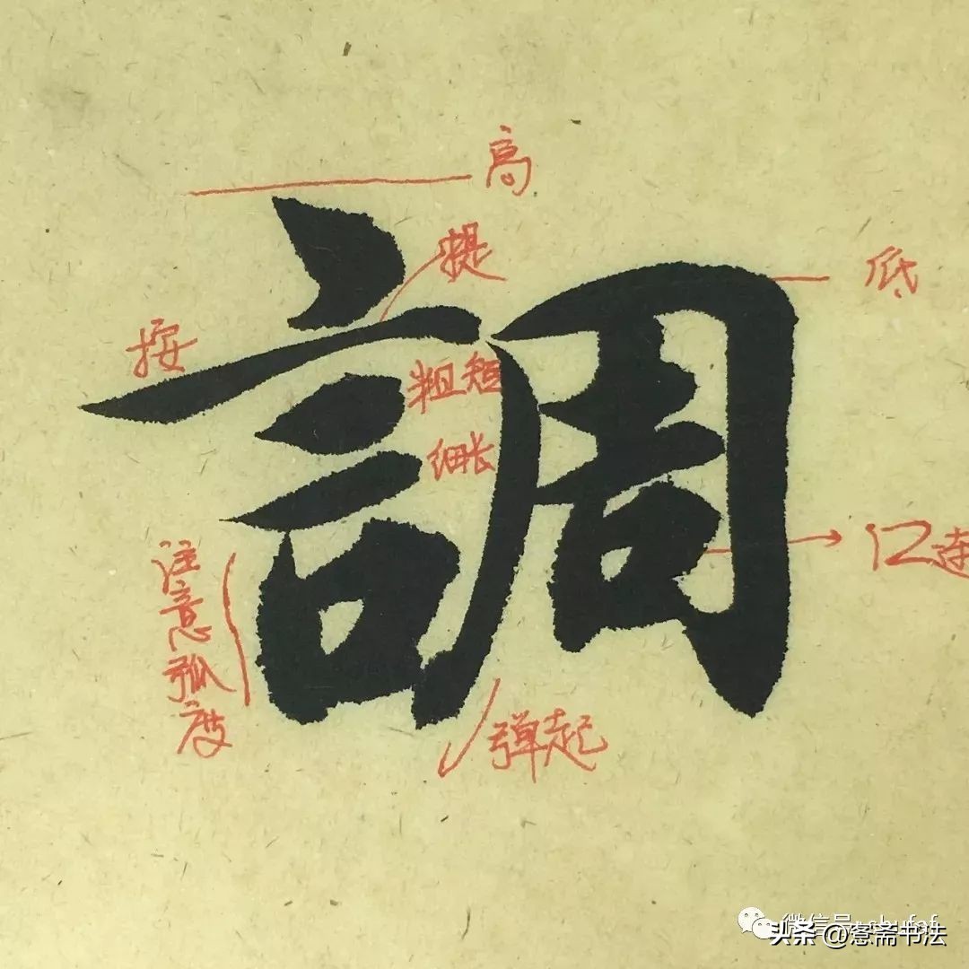 “调”字左右结构,两者的形态上有较大区别,左边“言”部的外形不规则,右边周部的外形较整。第一笔,点的形态值得关注,先斜切入笔,向右行笔,形成一个小短横,交代清楚之后再向左出笔。