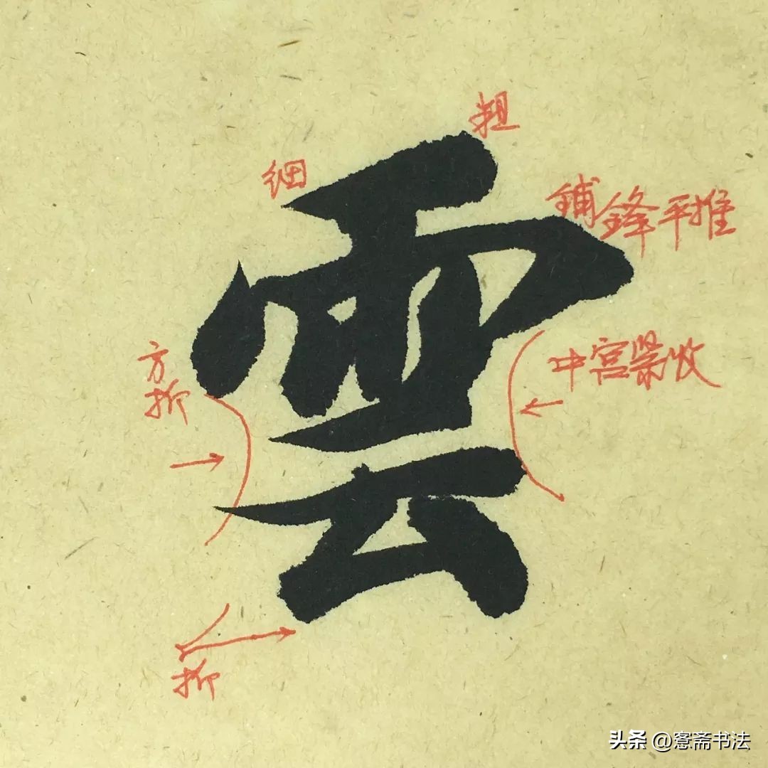 “云”字的形态值得关注,整个字略向右上角倾斜,这是智永楷书造型上的一个特征。中宫紧收,非常凝聚。第一笔,短横是一个完整的入笔动作,由轻入重,似点的形态。最下方的折需要交代清楚,不可含糊。