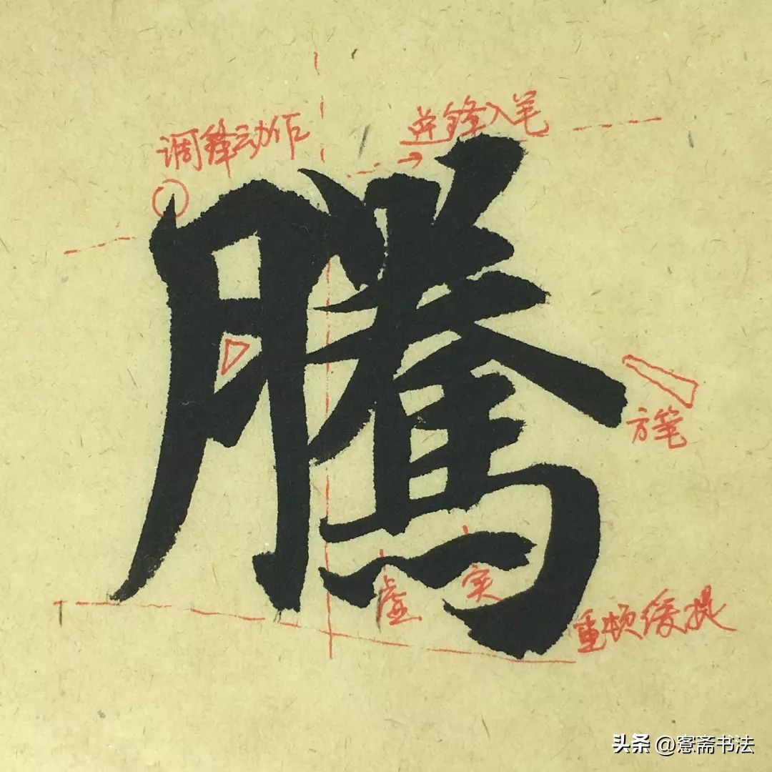 “腾”字左右结构,左小右大。第一笔“S”形入笔,这种方法在《兰亭序》中出现过,至褚遂良最为明显,其实这是一个空中入笔调锋的动作保留在了纸面上。机械地临摹比不上细致的观察与思考,带着问题临帖才有意思。