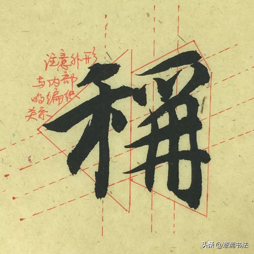 “称”字左右结构,两部分都呈斜势,具有动感。具有动感的字,处理的难点在于如何让两部分和谐凝聚。从图中的示意可看出,智永将两部分局部的点画都放在同一线条的延长线上,局部对应,形成经纬编织的关系。