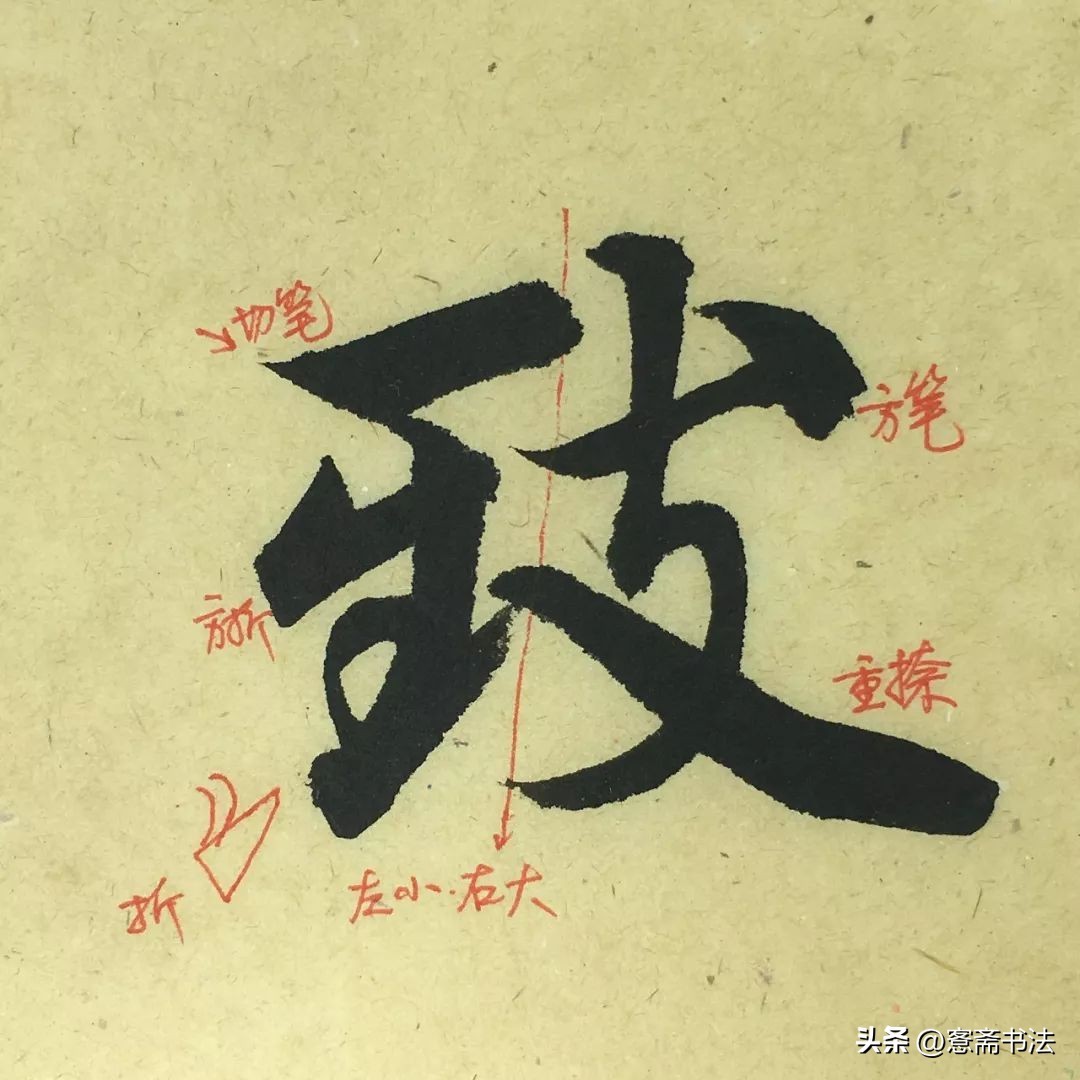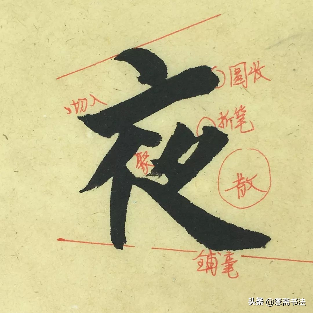 “夜”字是粗线条的字,整体呈块面状,与“称”字形成了对比关系,很好地形成了节奏上的错落。“夜”字的外形也呈斜势,自左向右发散,具有动感。临习这个字时,尤其要注意线条的起收笔形态。