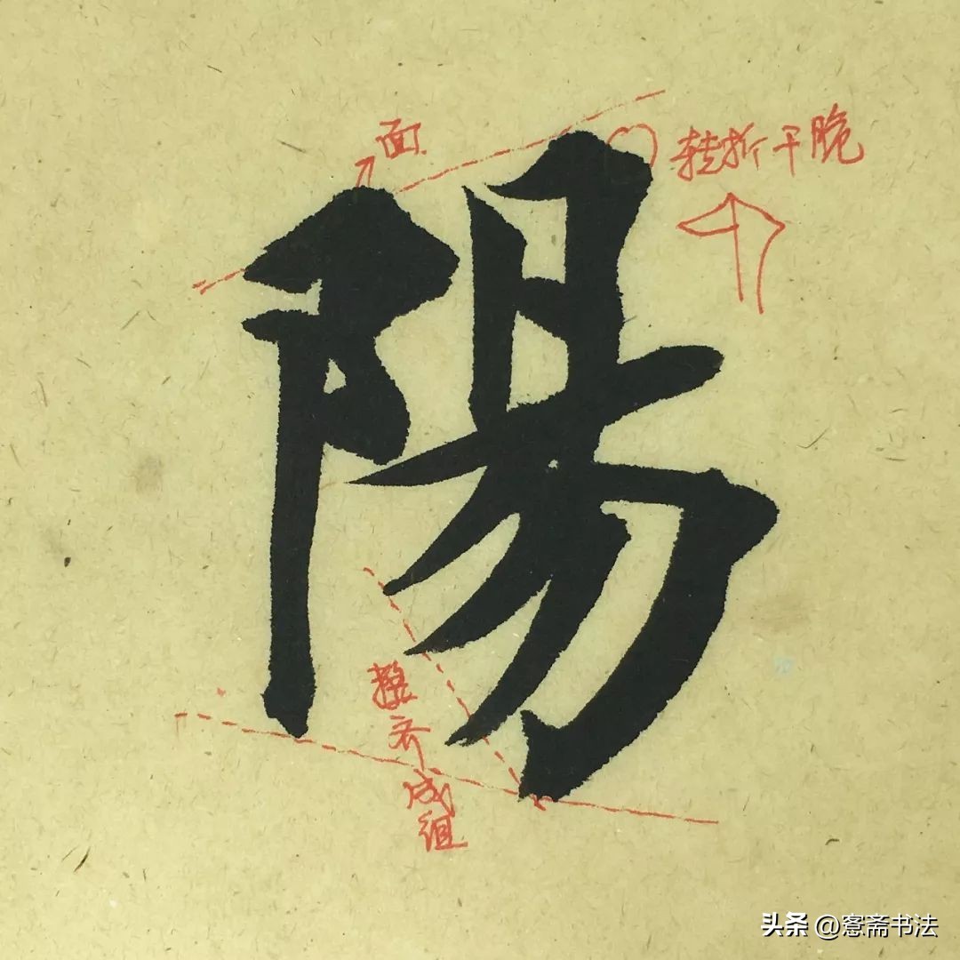 “阳”字右下角一组斜线非常漂亮,使得整个字具有动感,神采飞扬。三撇与勾画收笔处的虚连线是一条直线,排成一组,干净不乱。