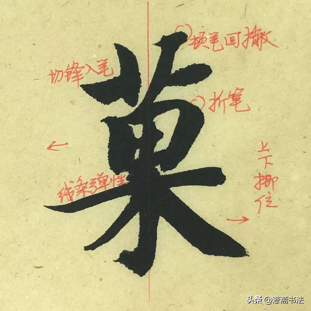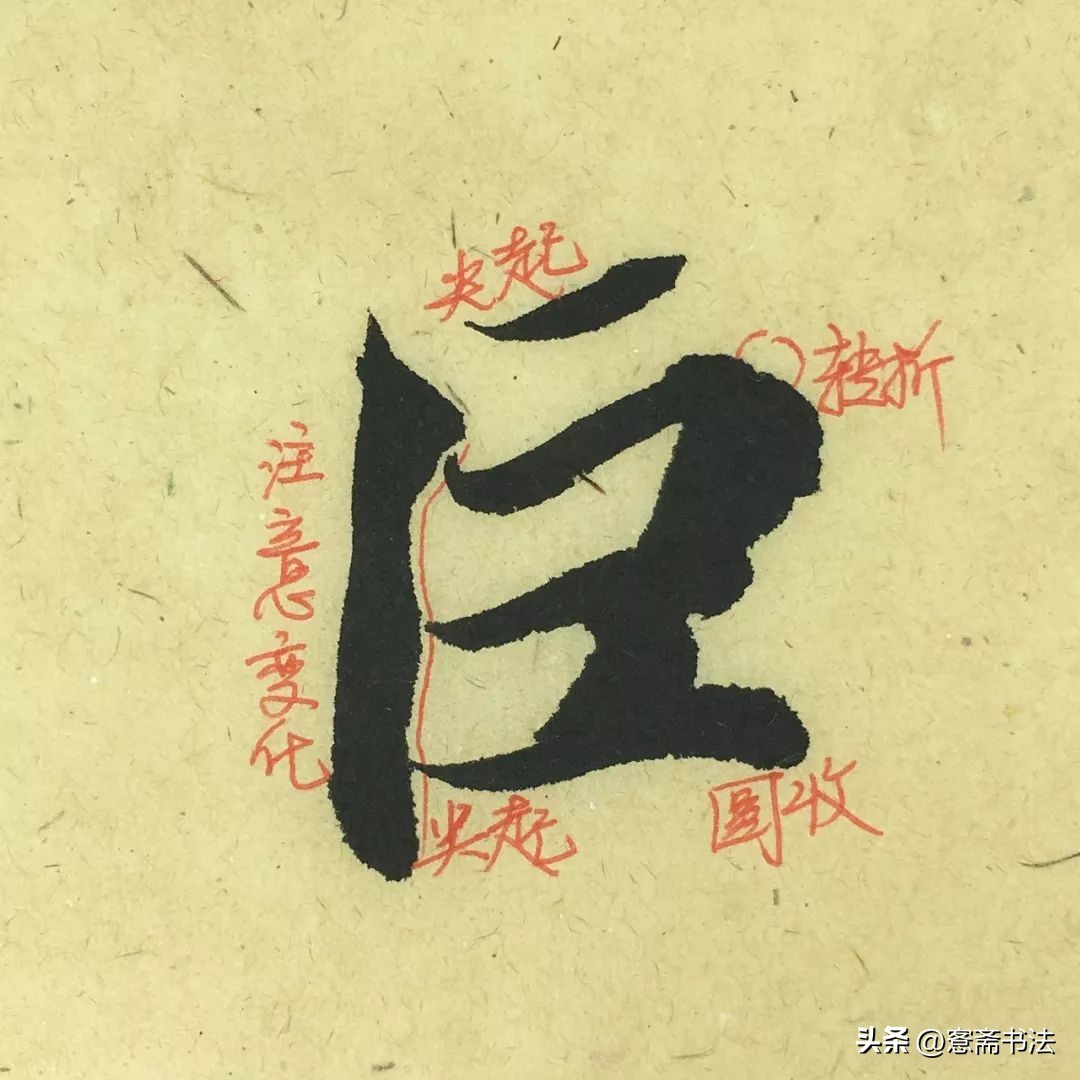 “巨”字是一个笔画较少的字,内部提按对比明显。提按体现的是毛笔的垂直运动关系。硬笔字与毛笔字最大的不同之一在于硬笔基本都是横向的的运动,而毛笔能够运用垂直运动来体现块面的关系。