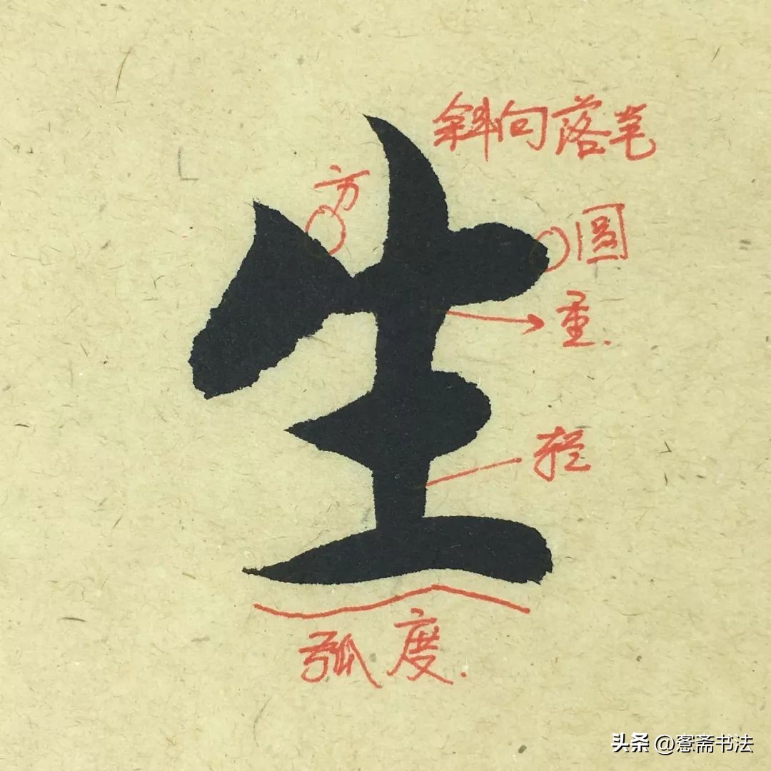 “生”字笔画较少,结构不好写。整体是一个含蓄的收势。三个横画都较短,不可将末横概念性地写得太长。竖画露锋入笔,有弧度。