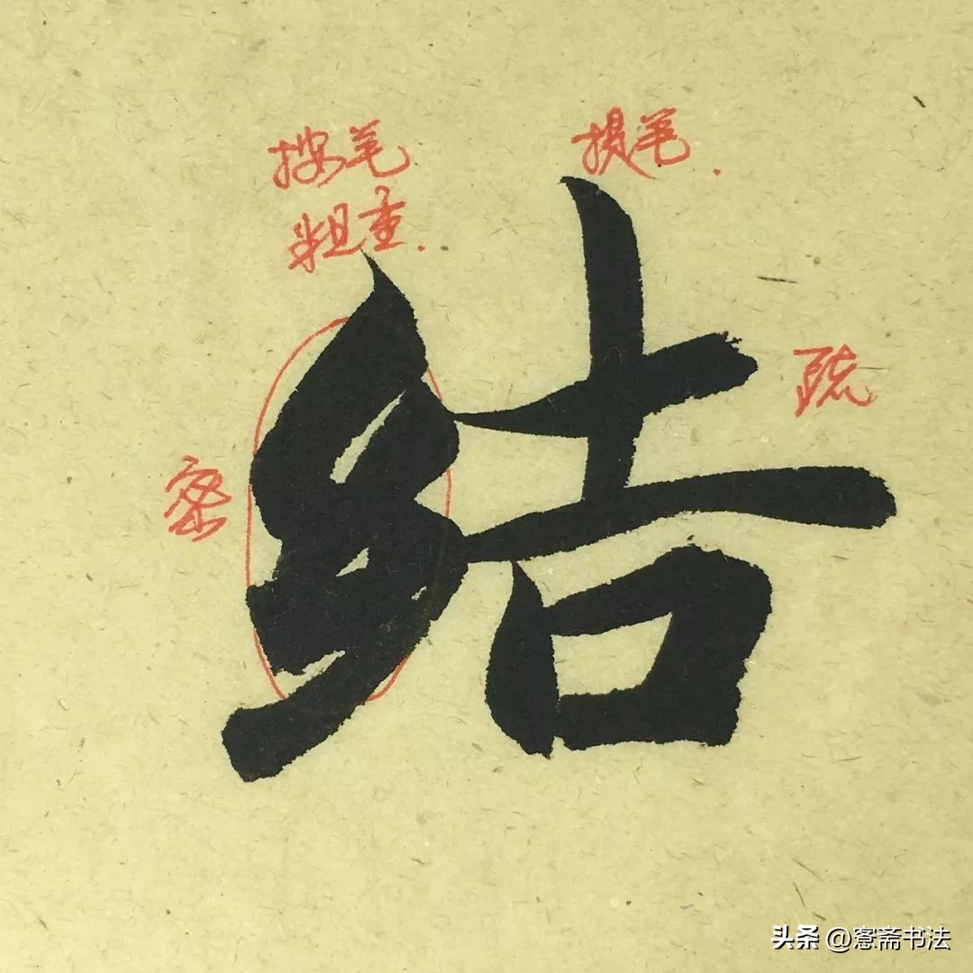 “结”字左右结构,左右粗细对比极为明显,是字内提按对比的典型代表。临习的时候应学会加强此特征。