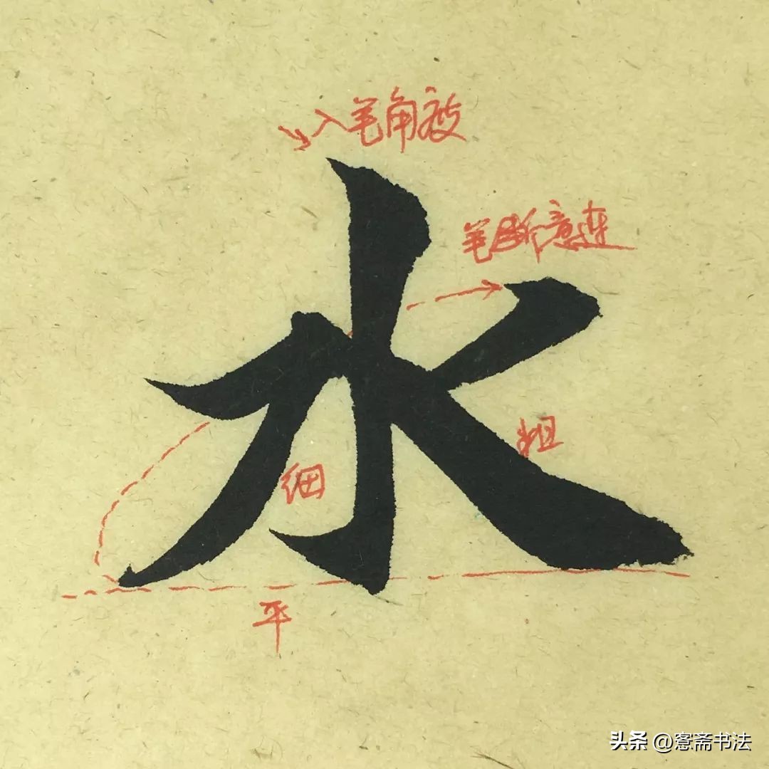 “水”字的竖画入笔斜势顿入,呈面状,然后折笔下行。竖画也有摆动的弧度,不可僵直。左右两个部分错位挪移,活泼灵动。写的时候注意提按关系以及线条之间的联系。