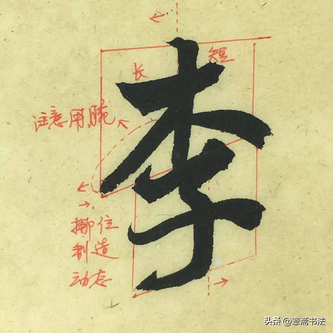 “李”字上下结构,两个结构的重心不在一条线上,形成了结构的动感。上部横竖交叉时,横左边长右边短,制造不平衡,下方又将“子”部向右挪动,解决不平衡的问题。“子”部横画弧度和提按关系都比较大,可拎出来多临几遍。