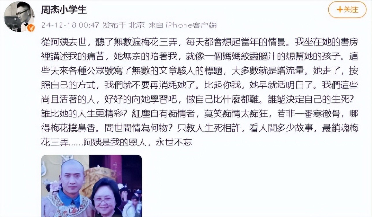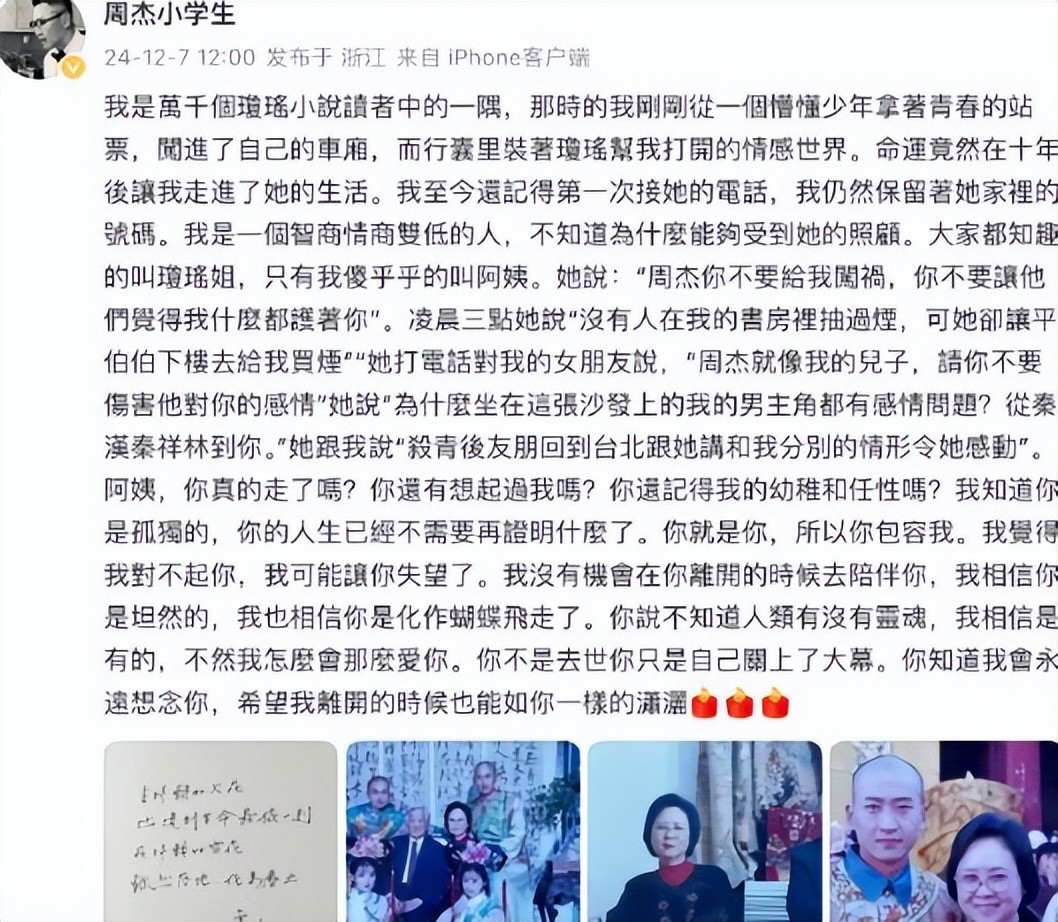 在琼瑶离世后的半个月之际,周杰再次发文,字里行间流露出对琼瑶深深的怀念与无尽的感激。
