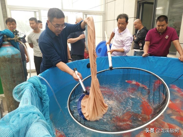 中国锦鲤界的“鱼神”郭斌先生在德州锦鲤池扬后亲自操网为各锦鲤业者和锦鲤超级玩家讲解锦鲤